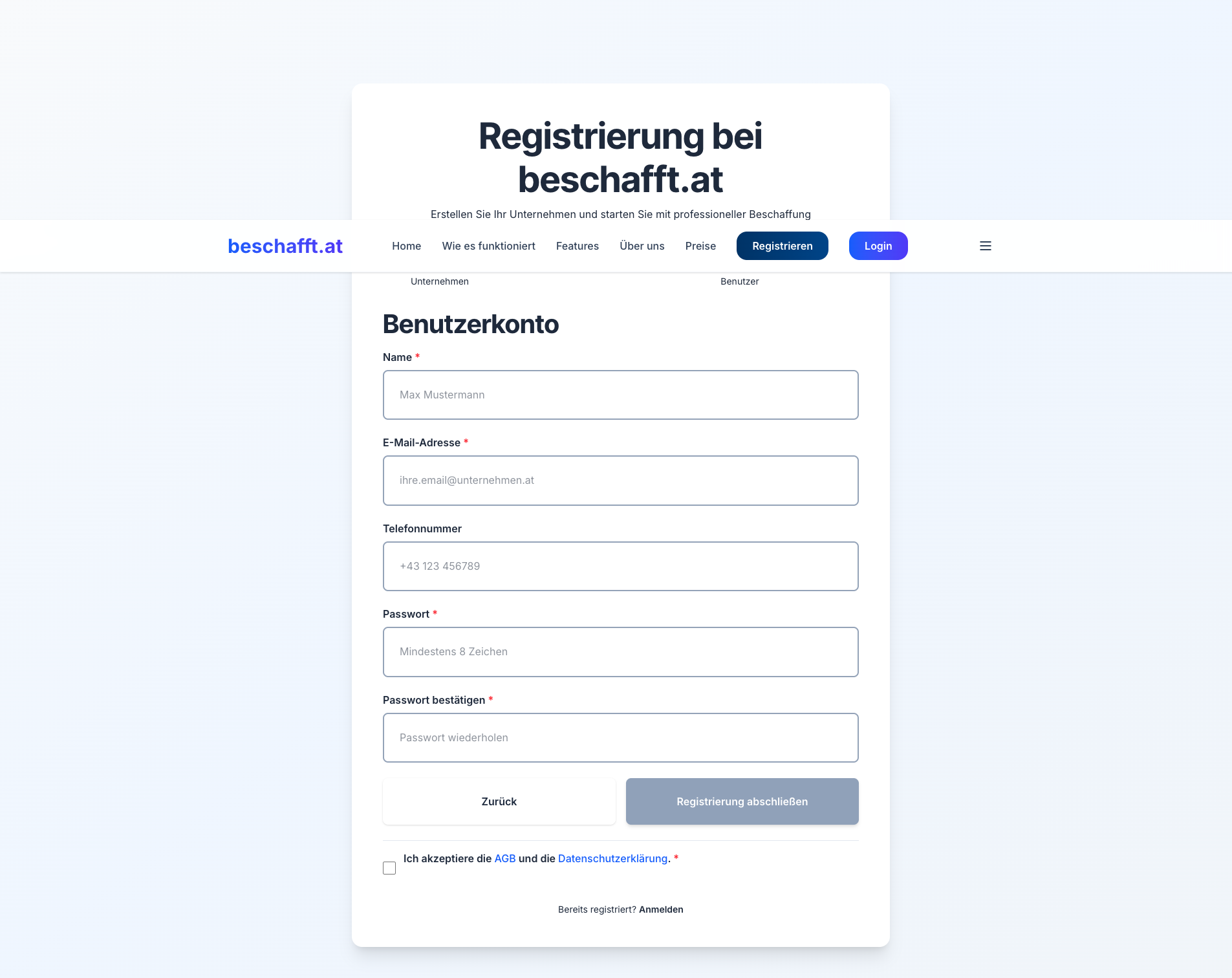 Navigieren Sie zu beschafft.at und klicken Sie auf "Registrieren" oder "Jetzt starten".